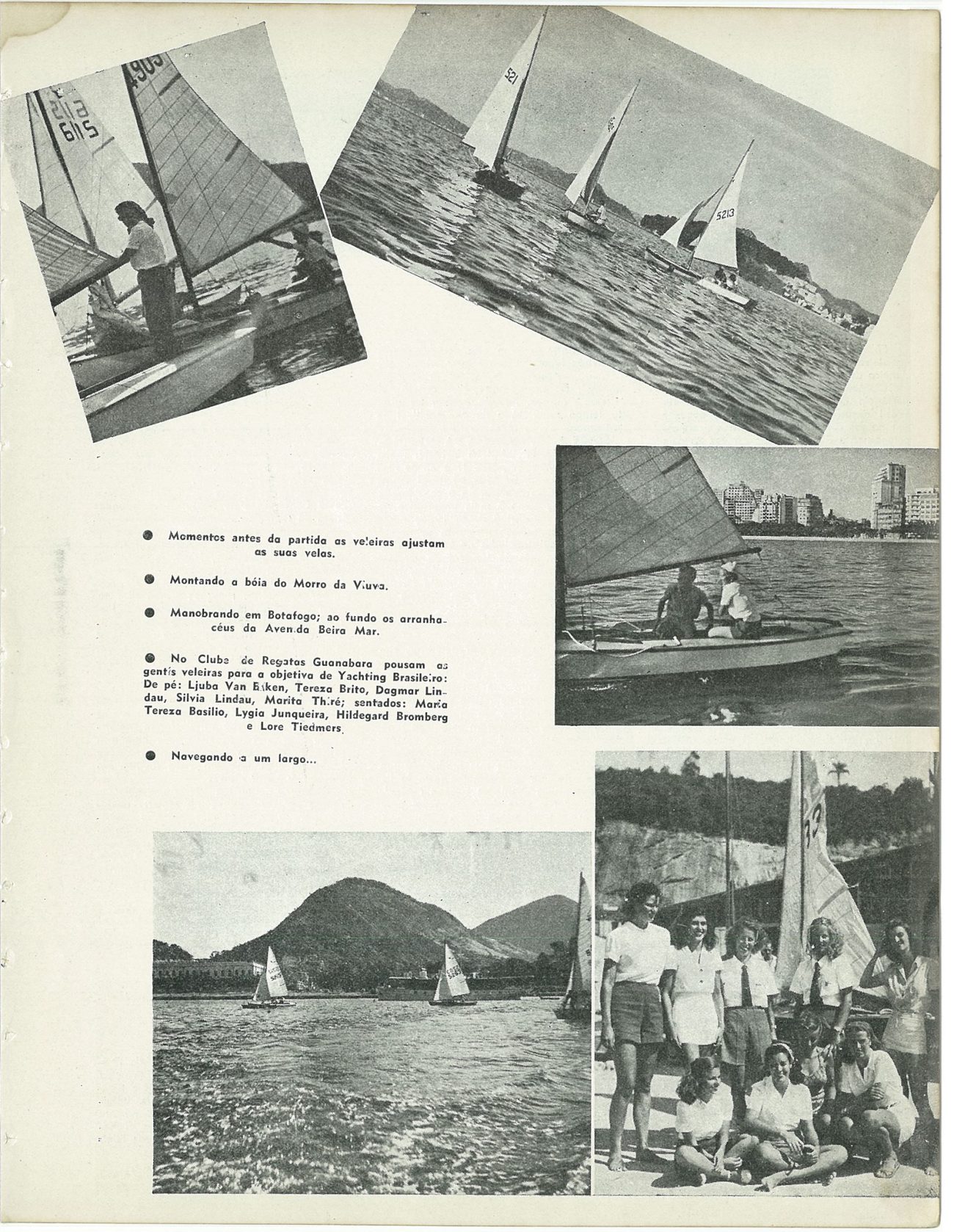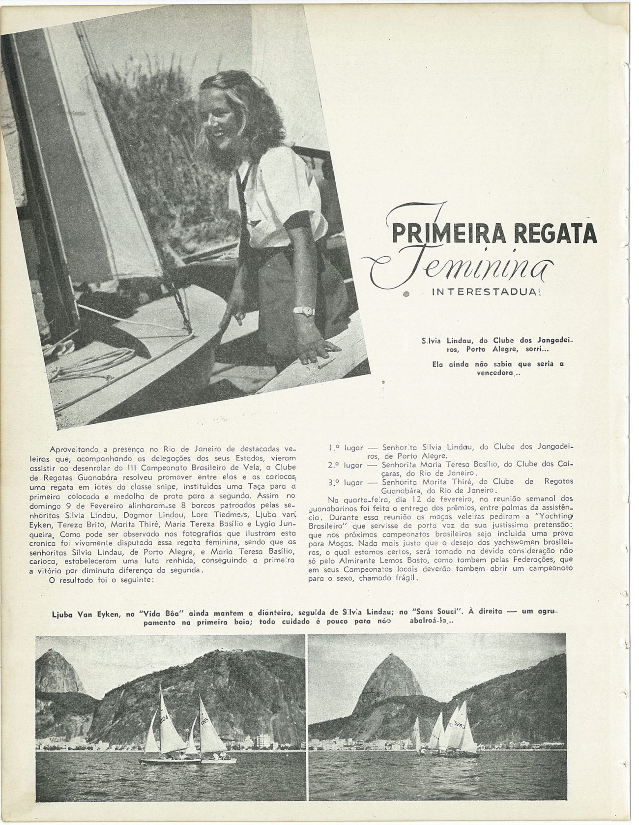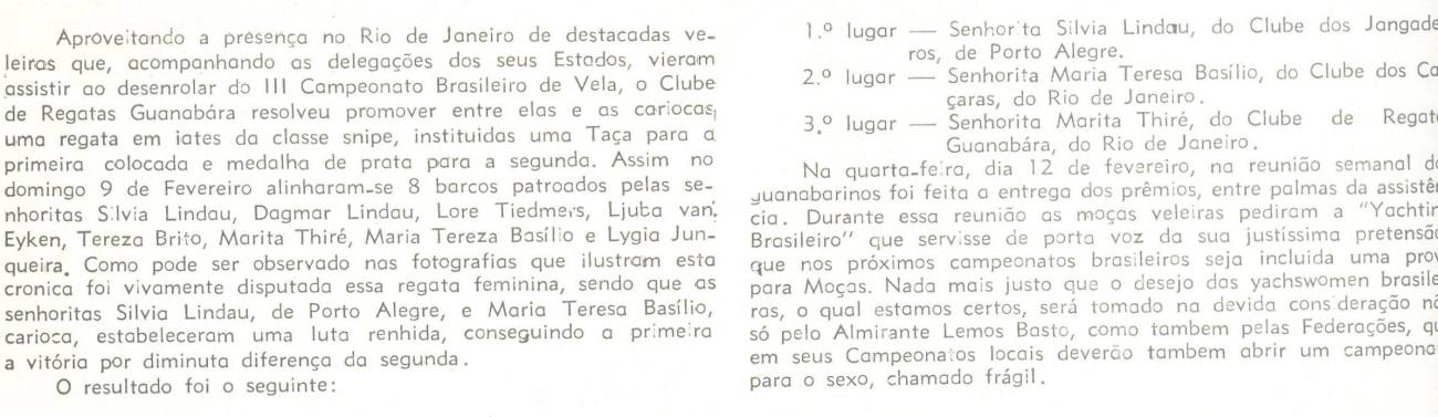 Aproveitando a presença no Rio de Janeiro de destacadas veleiras que, acompanhando as delegações dos estados vieram assistir ao desenrolar do III Campeonato Brasileiro de Vela, o Clube de Regatas Guanabara resolveu promover entre elas e as cariocas uma regata em iates da classe snipe, instituídas uma Taça para a primeira colocada e uma medalha de prata para a segunda. Assim no domingo 9 de fevereiro alinharam-se 8 barcos patroados pelas senhoritas Silvia Lindau, Dagmar Lindau, Lore Tiedmers, Ljuba van Eyken, Tereza Brito, Marita Thiré, Maria Tereza Basílio e Lygia Junqueira. Como pode ser observado nas fotografias que ilustram esta crônica foi vivamente disputada essa regata feminina, sendo que as senhoritas Silvia Lindau, de Porto Alegre, e Maria Tereza Basílio, carioca, estabeleceram uma luta renhida conseguindo a primeira a vitória por diminuta diferença da segunda.