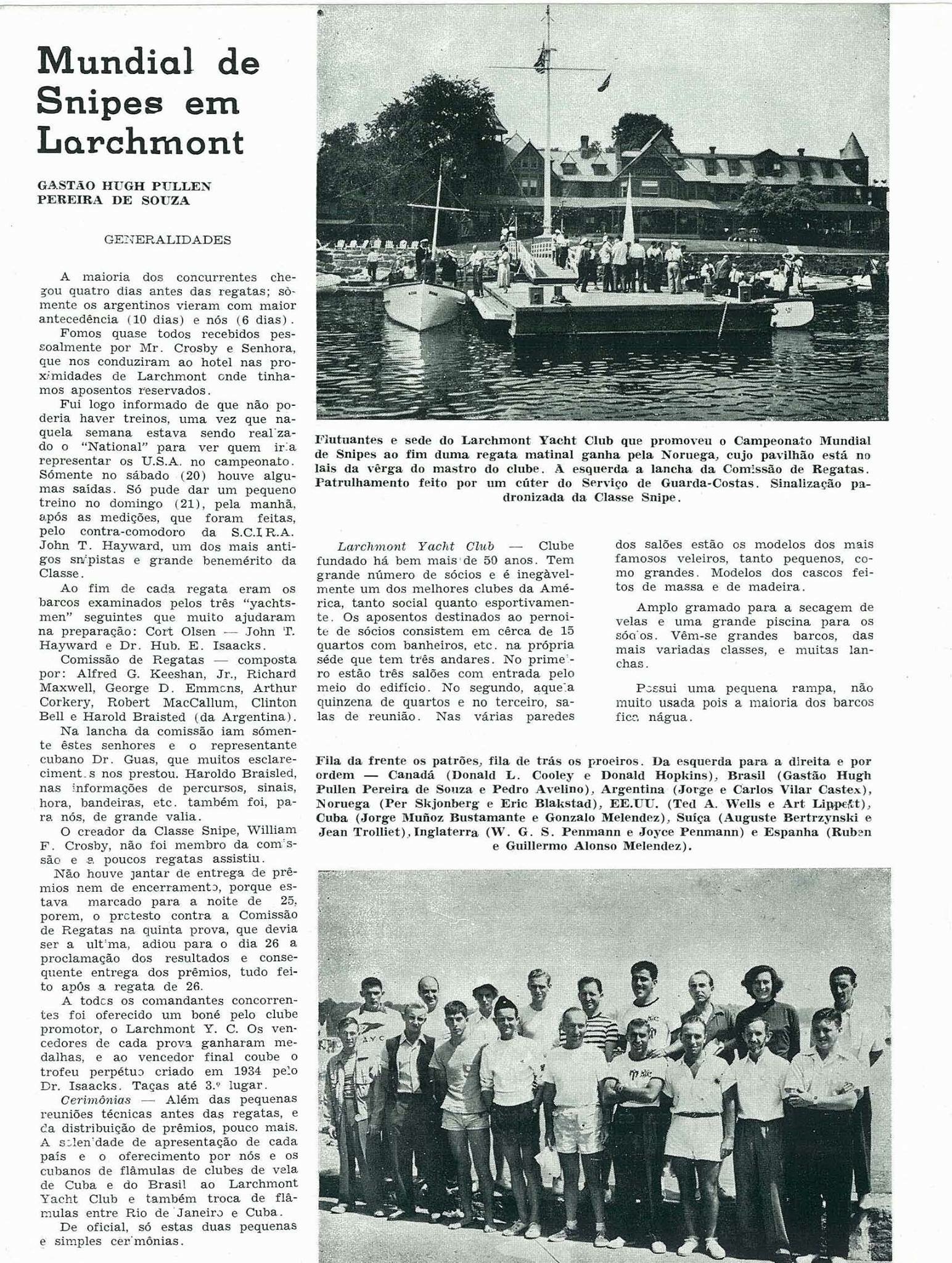 1947, Campeonato Mundial,ganho pelos Argentinos, os irmãos Villar Castex que suplantaram o poderosíssimo americano Ted Wells.Correção enviada por Gastão: o vencedor foi TED Wells em segundo lugar os irmãos Villar Castex.Retificação: Foi no ano de 1949 o Campeonato Mundial da Classe Snipe, realizado em Larchmont e a ultimas vez que entrei em um Snipe. Por ganharmos a passagem aérea, (apenas do timoneiro, e o resto era por nossos pai e mãe) tínhamos que fazer um relato detalhado e que seria aproveitado pelos futuros representantes do Brasil.