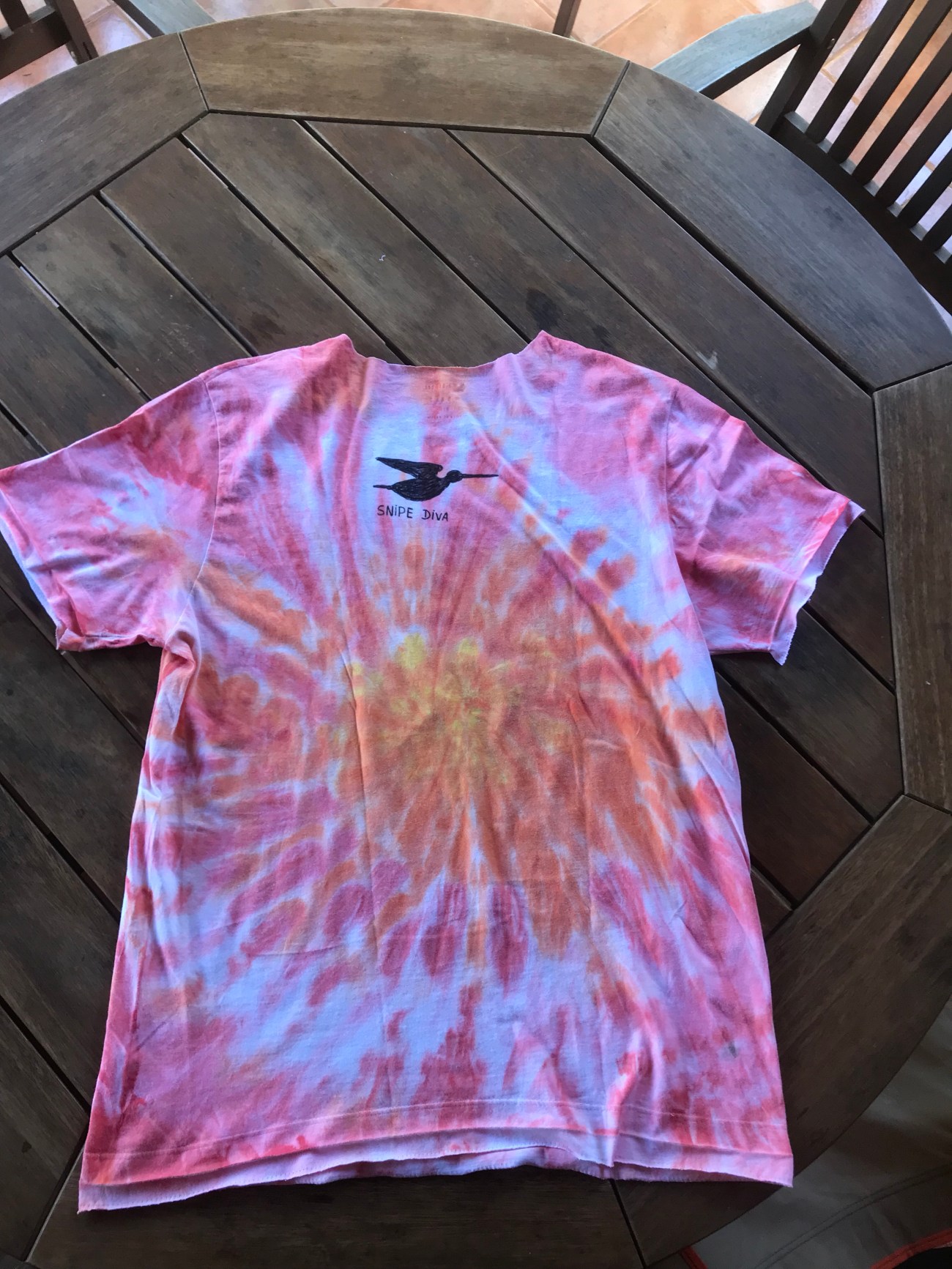 Tinha esta camiseta tiedye que fiz há um par de anos nas férias, achei que ela precisava de uma nova cara…