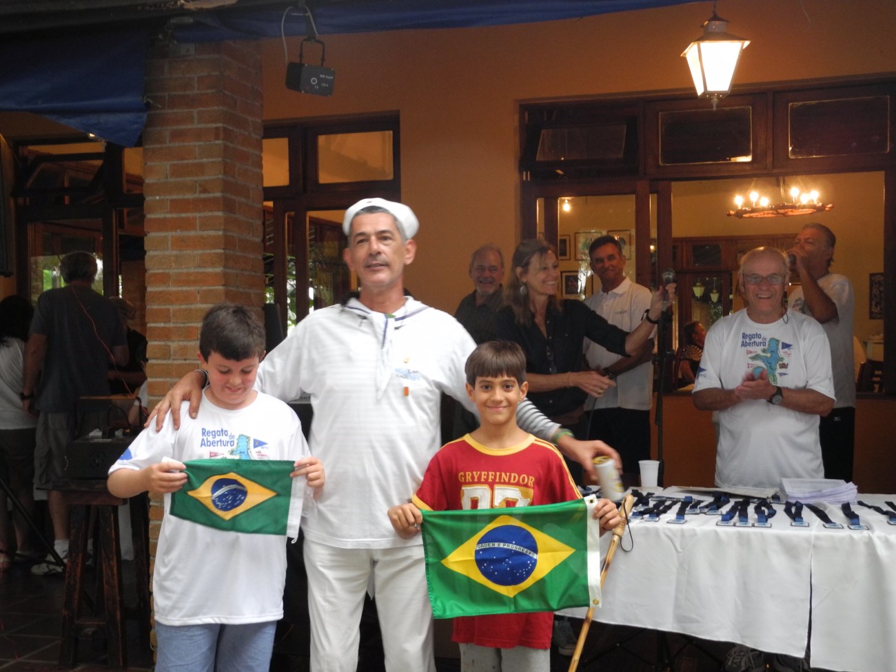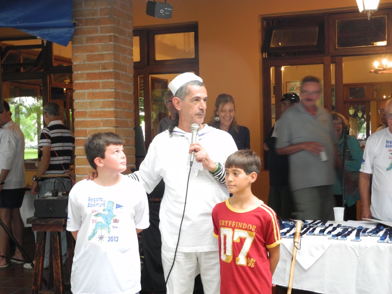 O cara, que é o Silvio Faleiros, começa a cerimônia de premiação chamando os dois primos pra ficarem ao seu lado e vai contando a história de perseverança dos dois, fala sobre não desistir, explica que se emocionou com os meninos agradecendo, e que na regata daquele dia (dos barcos dos adultos) houveram muitos palavrões, xingamentos e falta de FairPlay.