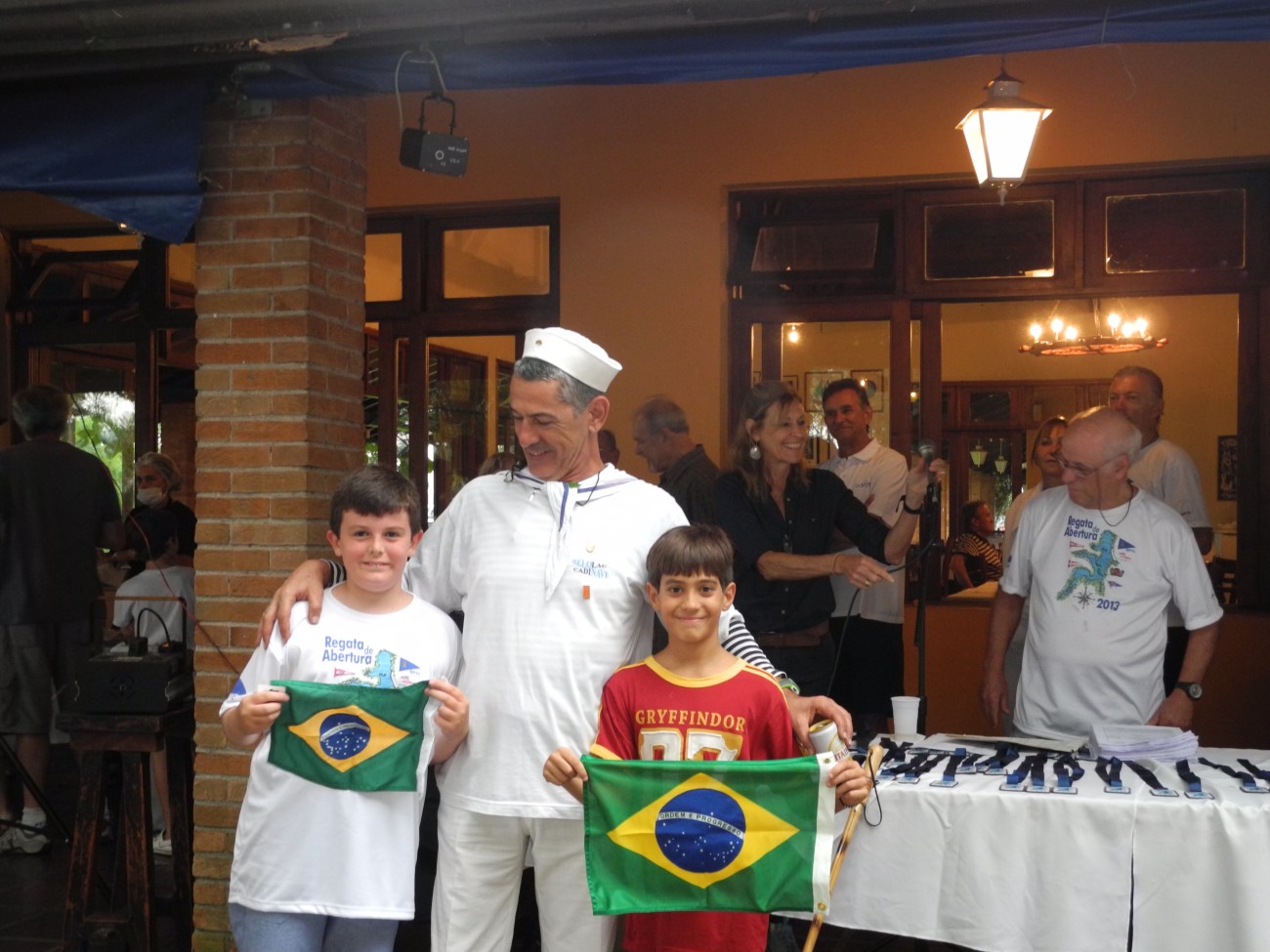 Eu passo pra agradecer de novo a organização pela gentileza do dia anterior, e este cara vestido de marinheiro me pergunta se os dois velejadores de Optimist estão ali na premiação, respondi que eles estavam sim (velejador bacana sempre vai à premiação, independente se ganha prêmio ou não, afinal é importante prestigiar os organizadores, conversar com os amigos de outros clubes e aplaudir os premiados!)