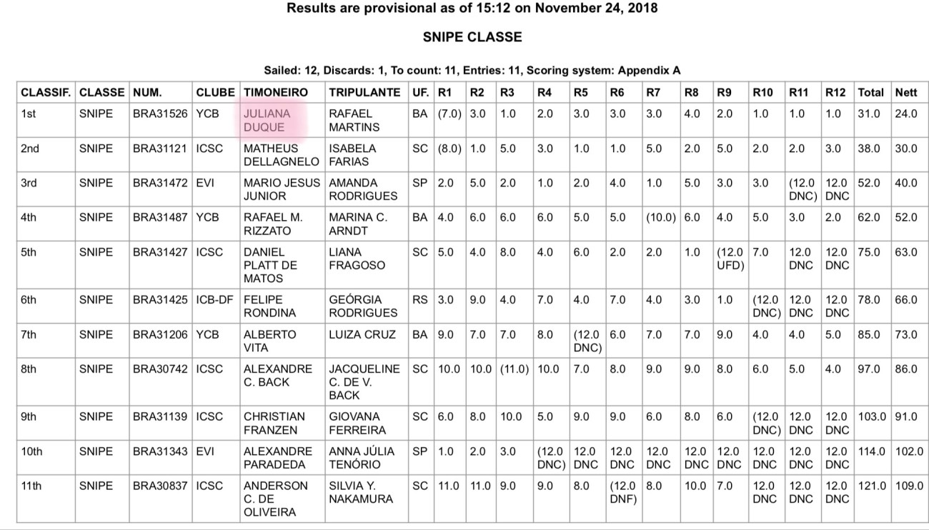 No snipe a tripulação tinha que ser mista. Disputaram 11 duplas mistas, 10 delas com o homem no leme e a mulher na proa, e uma tripulação de Salvador com a Juliana Duque no leme e o Rafael Martins na proa, casal super querido e simpático que levou a vaga pros Jogos Panamericanos de 2019 em Lima .