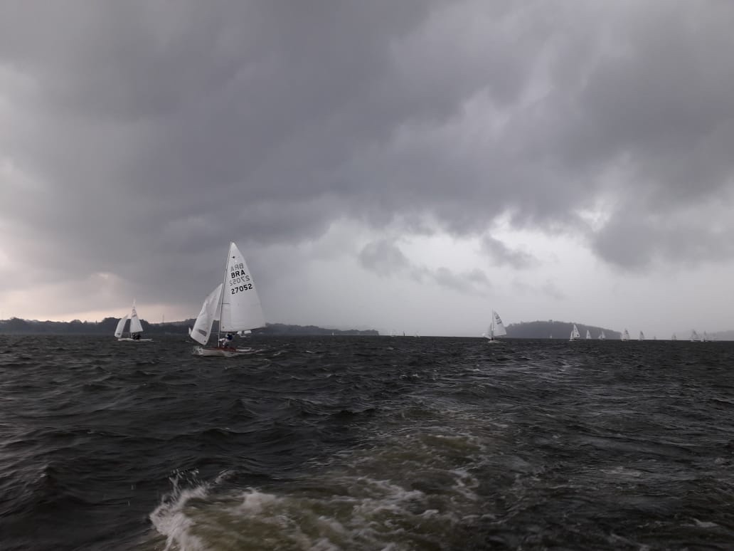 Chovia bastante, trovoadas e raios além daqueles pingos doídos. Chegamos na baia do clube e lembrei que os marinheiros não podem trabalhar enquanto há raios… olho pra rampa e vejo movimento de varias pessoas, gente dentro da água ajudando a segurar os barcos, gente ajudando a pegar as carretas, gente fazendo força pra empurrar os barcos rampa acima e voltando rápido pra baixo… quem? Os snipistas! Fazendo o quê? Sendo snipistas oras! Com ajuda dos colegas snipistas levamos o Tangerine pra cima, colocamos no hangar pra tirar do caminho e voltamos pra ajudar os outros barcos.
