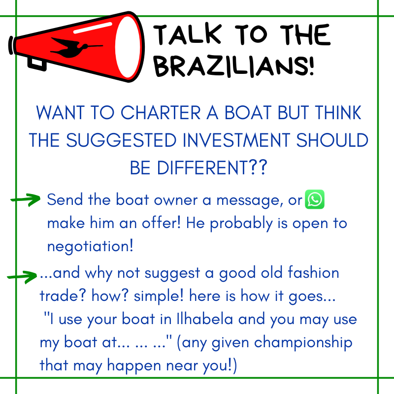 So if you gave a thought on coming, but still don’t know how… talk to the Brazilians! There is a list here with sailors that want to charter their boats… http://bit.ly/2019SWC-rental they probably are open to negotiation, and we may be able to help you too!