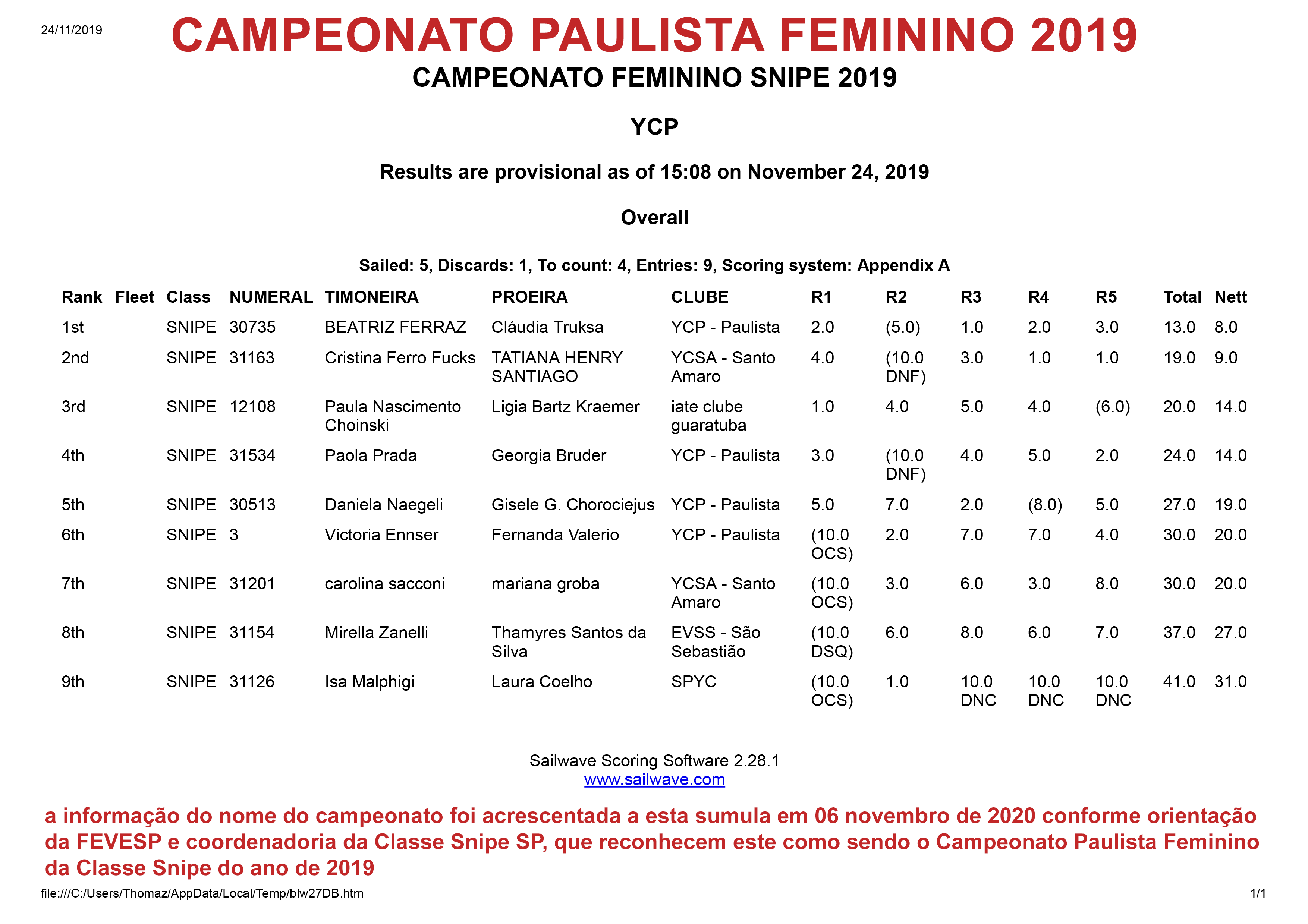 No Campeonato Paulista foram 21 SNIPEdivas; 3 tripulações femininas e mais 15 divas proa.