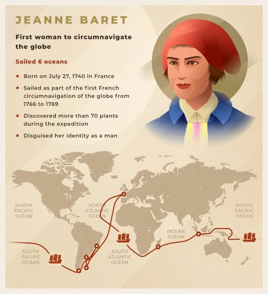 Nascida em Borgonha, na França, Jeanne é reconhecida como sendo a primeira mulher a circum-navegar o globo. Um ícone na navegação feminina Jeanne teve que se disfarçar de homem e se alistar com o nome de Jean Baret, nome do seu pai, para estar nas fragatas francesas La Bouseuse e Étoile do grande navegador francês, o conde Louis Antoine de Bougainville.