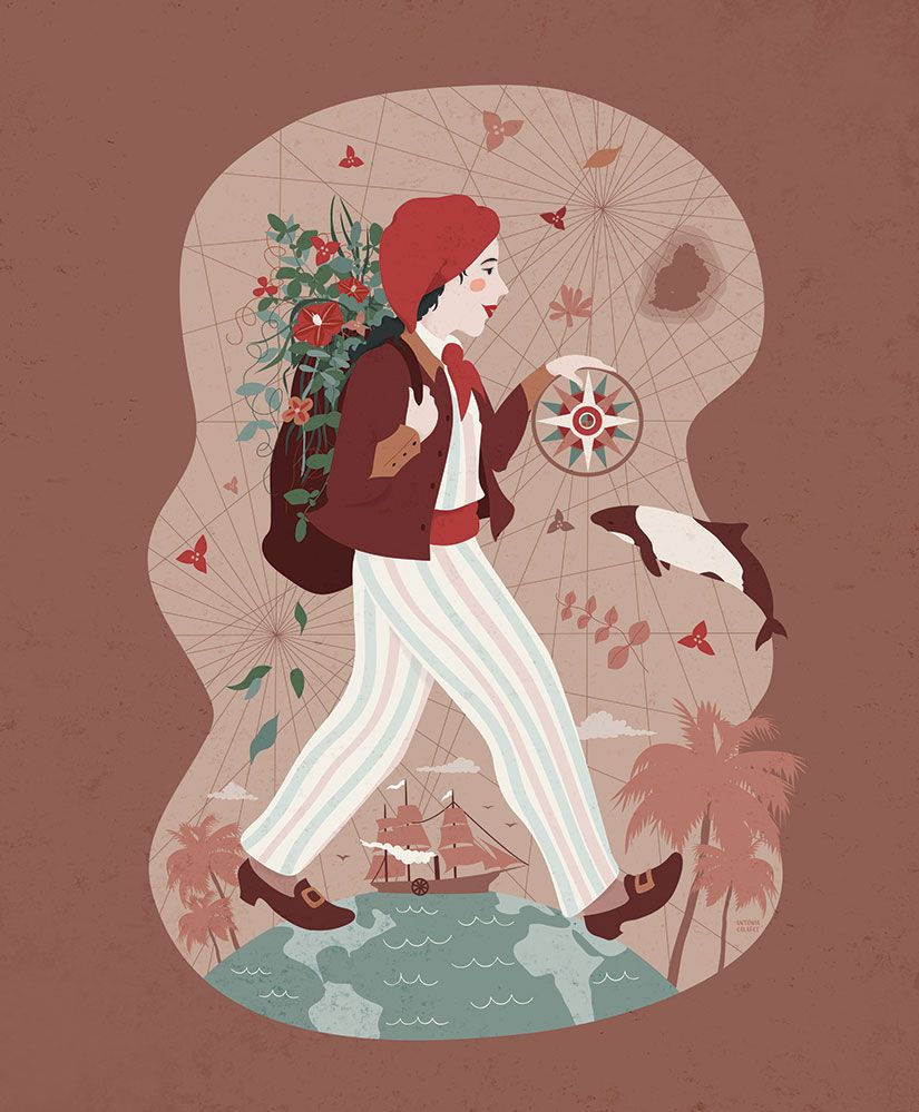 Durante a confecção da imagem, a doodler quis utilizar os bougainvilles como peça obrigatória da ilustração. “Jeanne Baret tirou uma amostra dessa videira em flor quando viajava pelo Brasil. Eu sempre amei esta planta e definitivamente queria incluí-la”.