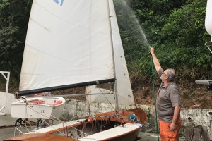 Chegamos no YCP por água e começamos a dar um banho nele, pra tirar o pó… Também aproveitamos pra trocar alguns elásticos, mas foi praticamente só isso que tivemos que fazer pra que ele estivesse pronto pra Regata de Abertura do SPYC no dia seguinte!